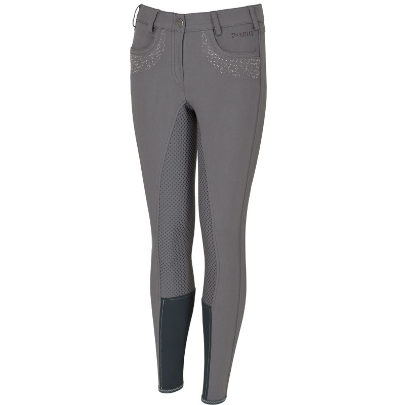 Beautiful looking children's riding breeches from the brand Pikeur due to the finish of rhinestones on both the front and back. The Kalotta Grip kids has jeans pockets on the front, a polyurethane Grip seat and elastic section at the ankles.