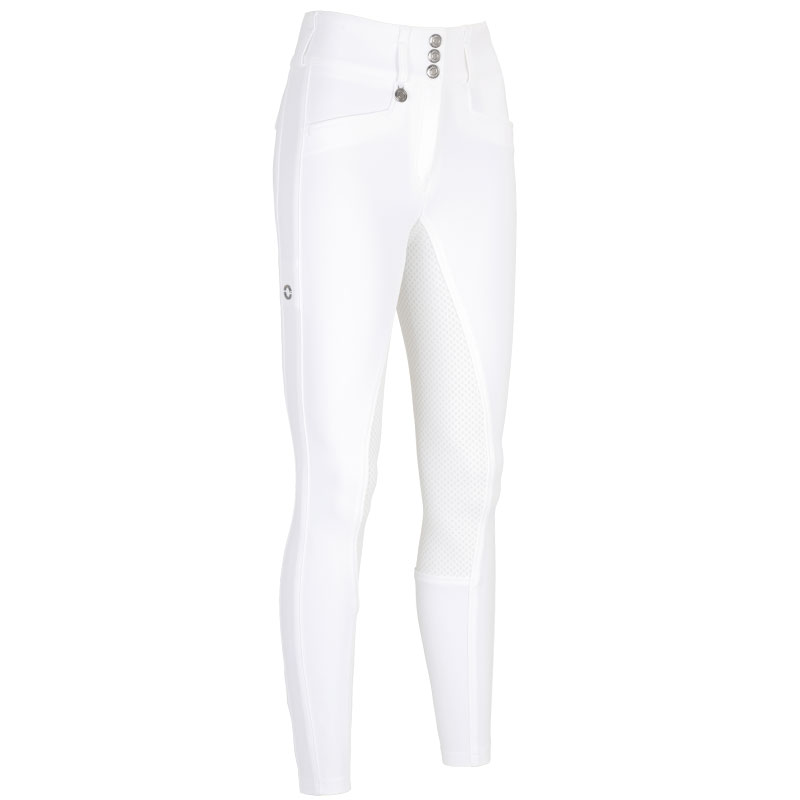 The New Candela 3976 White competition pants are made from a new four-way elastic Jersey technical fabric. This fabric is breathable, sweat-absorbing and UV-resistant. The fabric also hides imperfections and molds to the body. The riding breeches are finished with high-shine nickel-colored closures, nickel-colored logo on the waistband, nickel-colored logo on the mobile phone pocket and have a Full Grip polyurethane seat.
