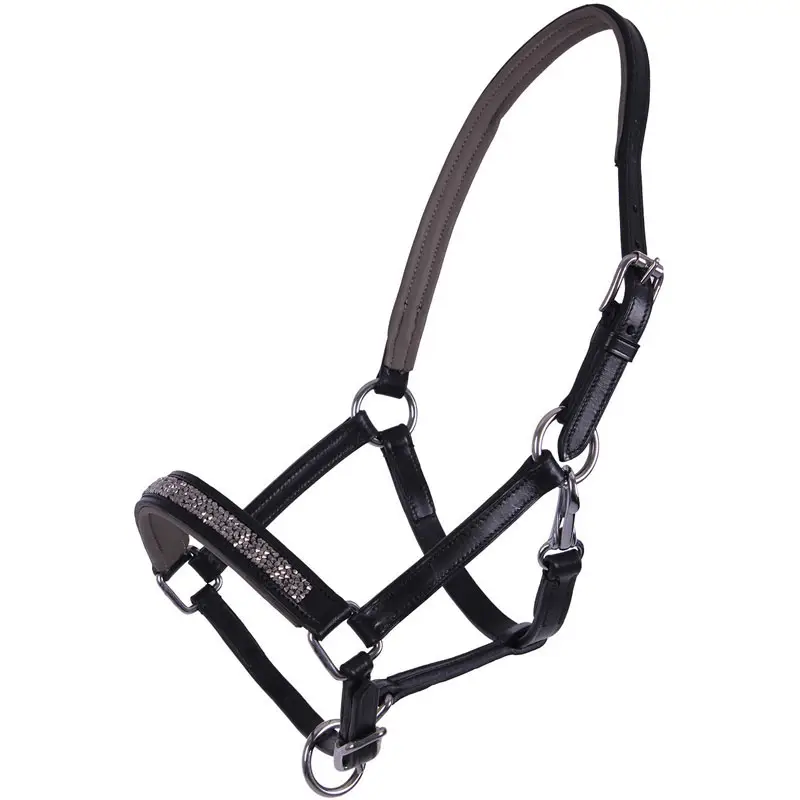 Luxury leather foal halter model Lupine of the brand QHP. The halter is adjustable in size, has gray padding on the headpiece and under the noseband and is finished with scattered rhinestones in the noseband.